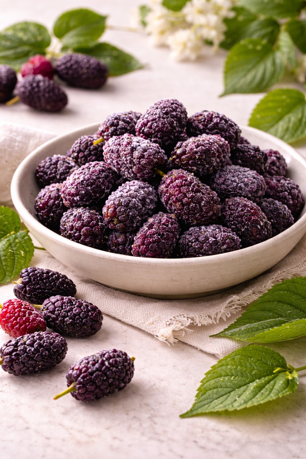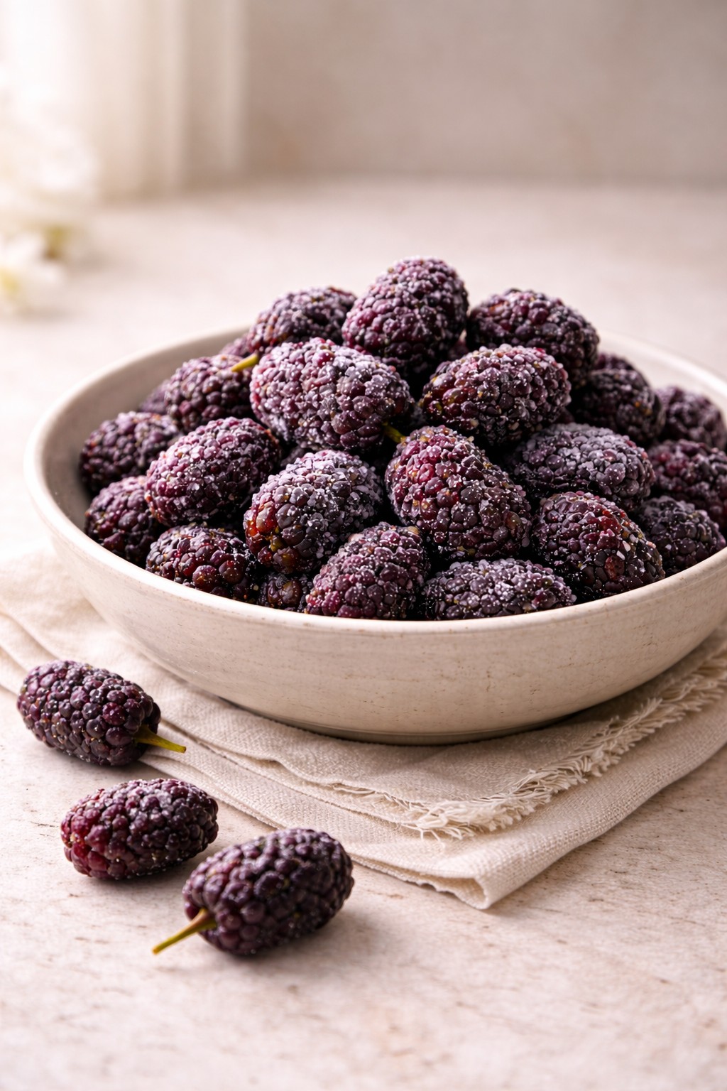 桑葚果汁極強,接觸後手部稍有染色屬正常花青素反應。若要搭配鬆餅或甜點,建議在冷凍狀態下擺盤,隨時間緩緩融化的深紫色澤將展現最自然的裝飾藝術感。